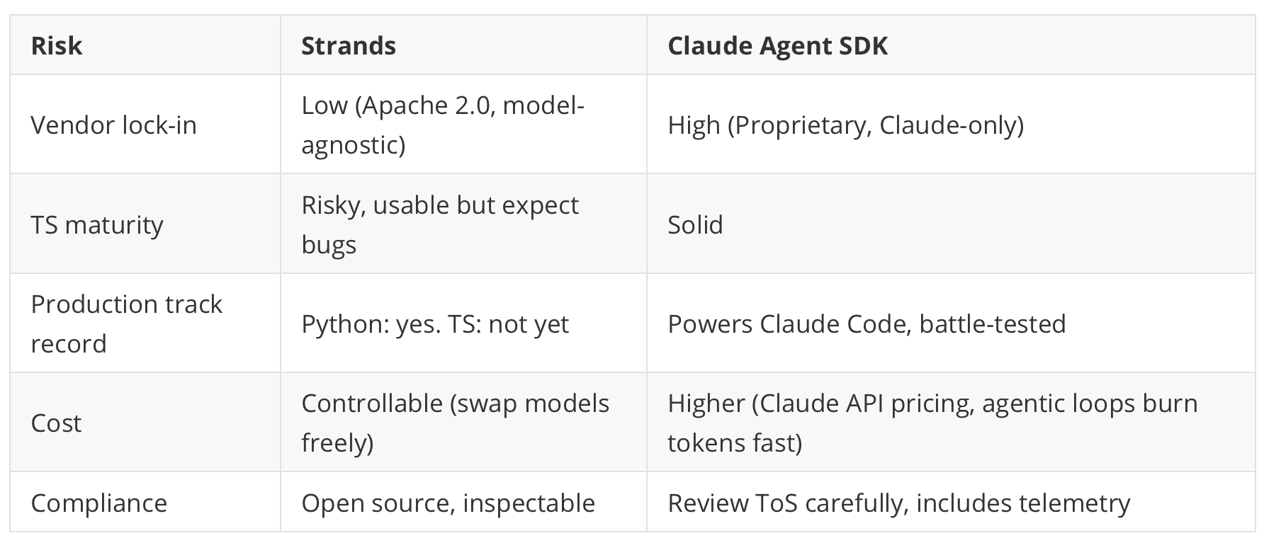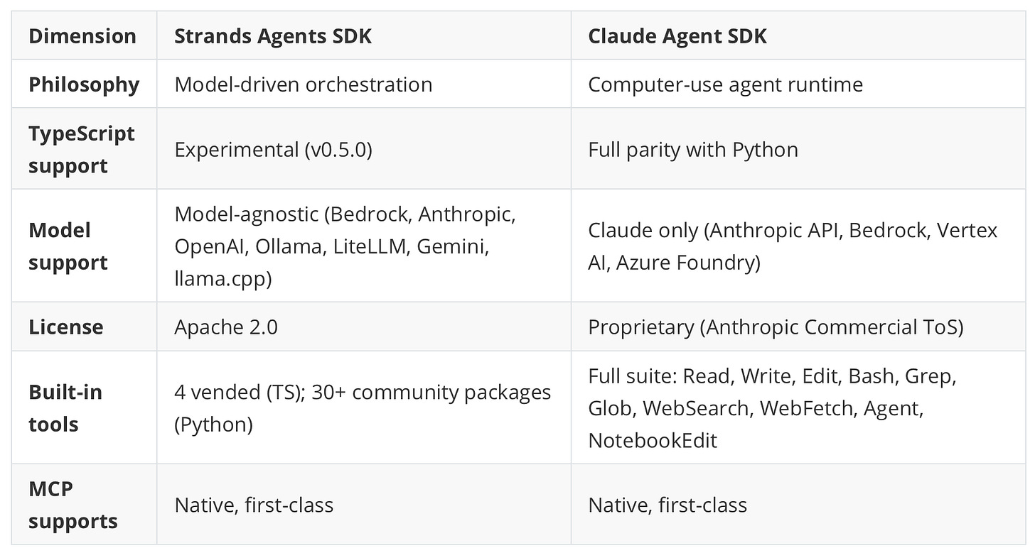 One thing the table doesn’t capture: the Claude Agent SDK’s proprietary license means you can’t fork it if Anthropic changes terms or pricing. With Strands, worst case, you have the source code. In enterprise procurement, this distinction matters more than most engineers think.